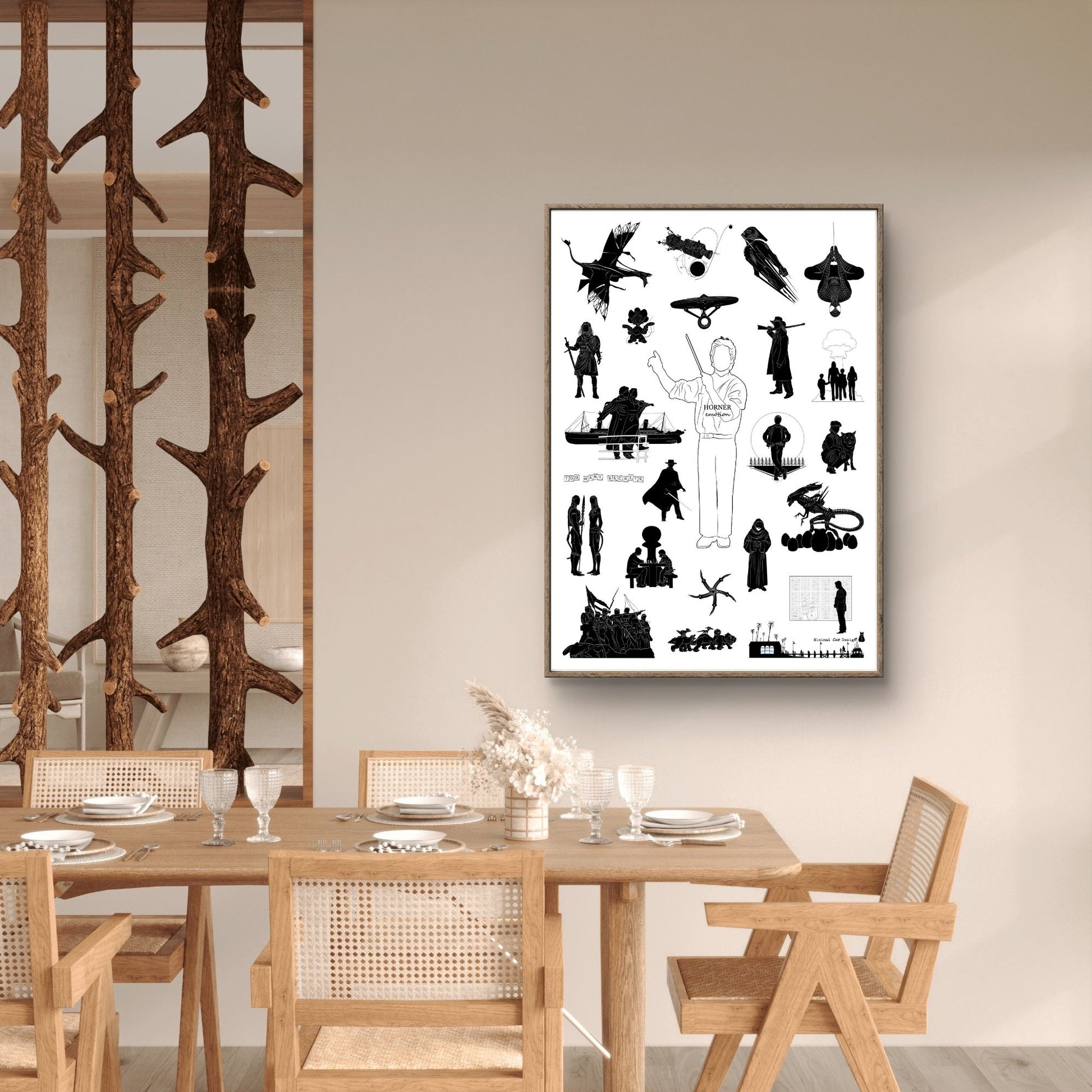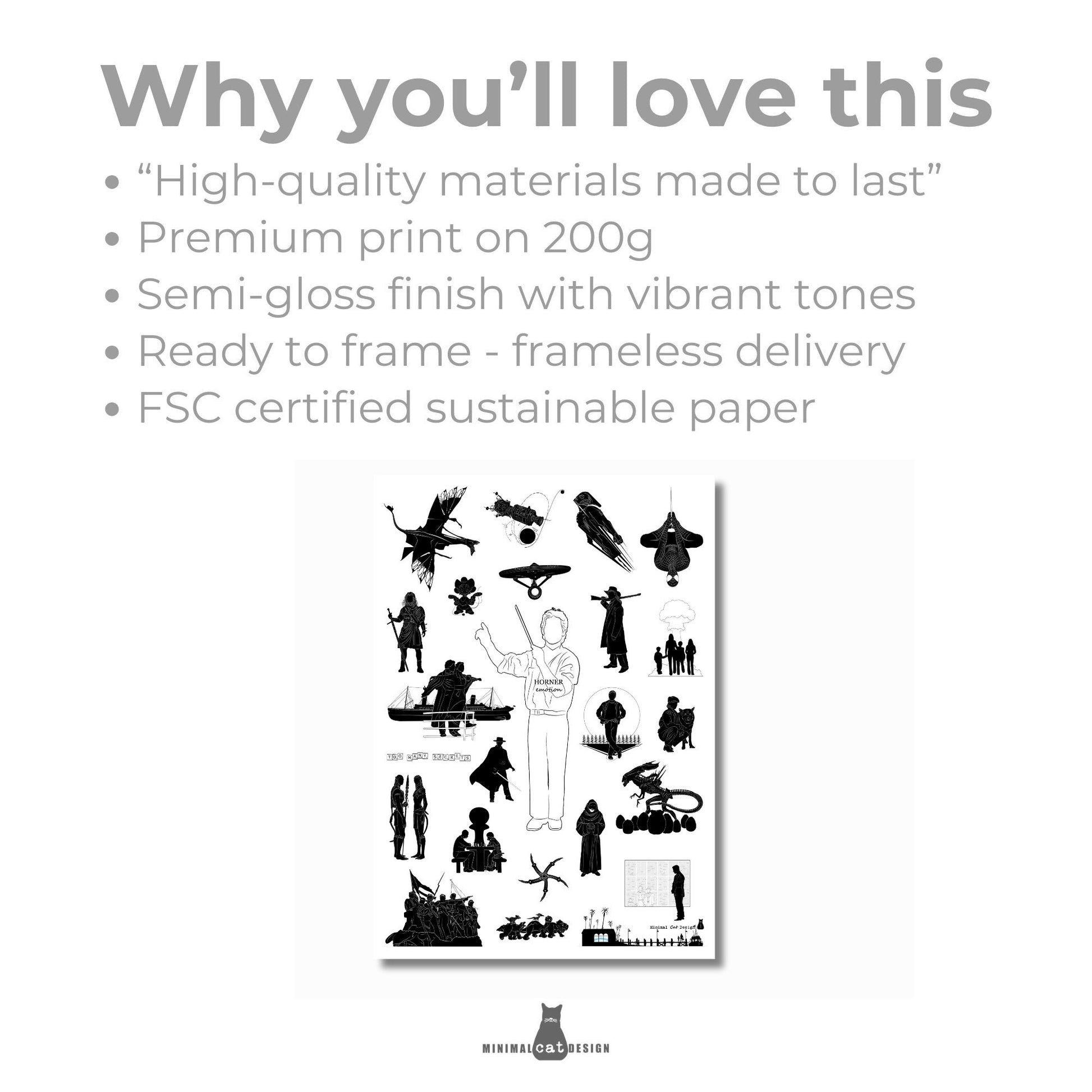 Si te encantan las bandas sonoras de James Horner y quieres un homenaje sutil y elegante a su filmografía, este póster es la pieza central perfecta para tu pared.