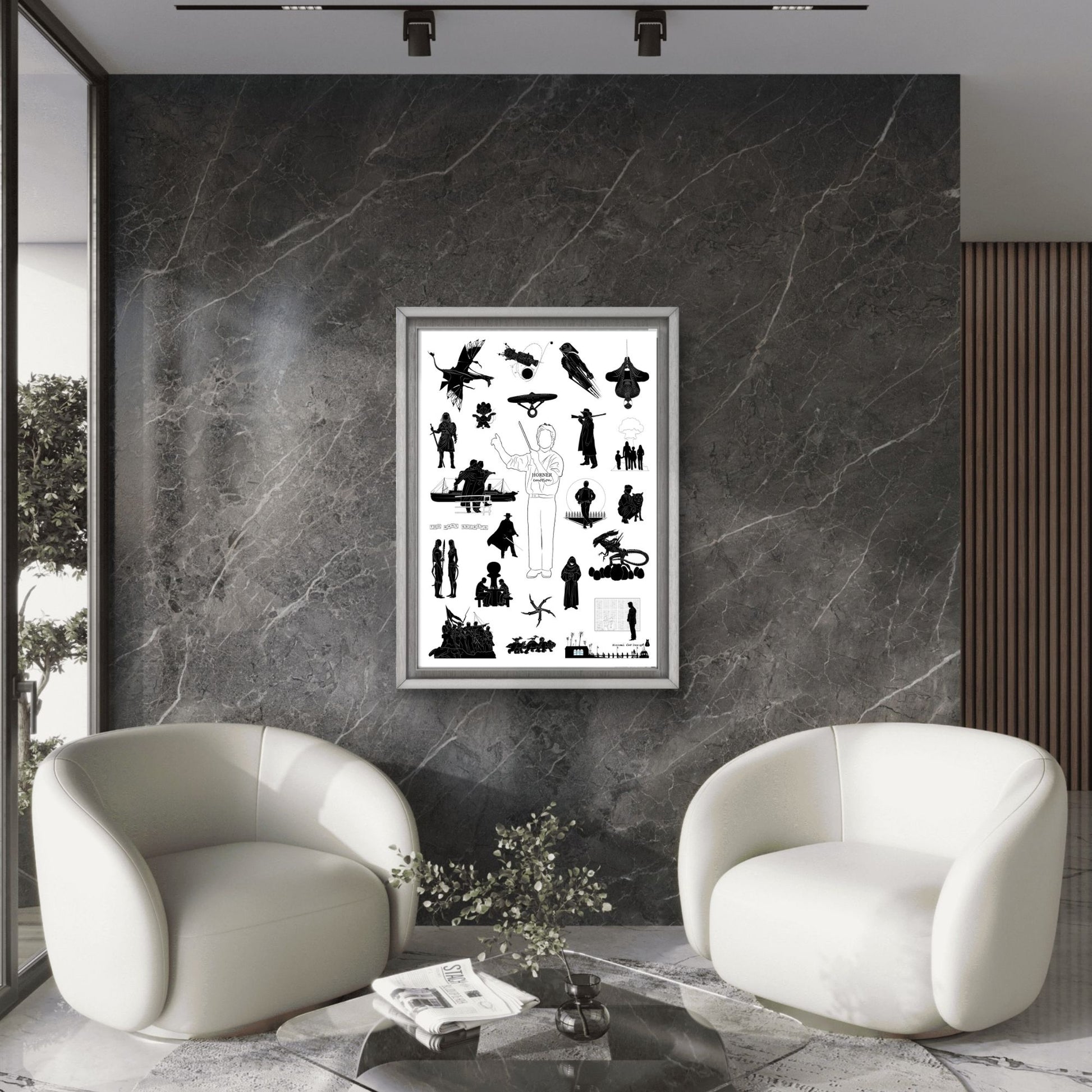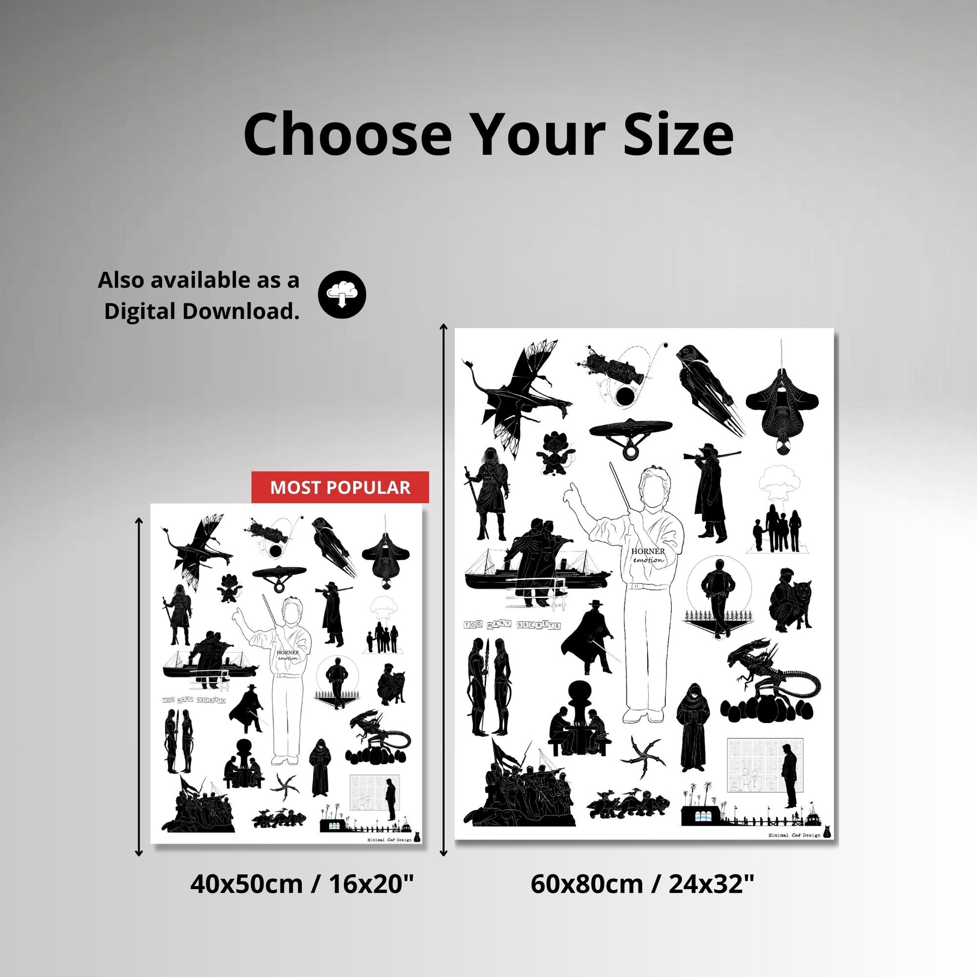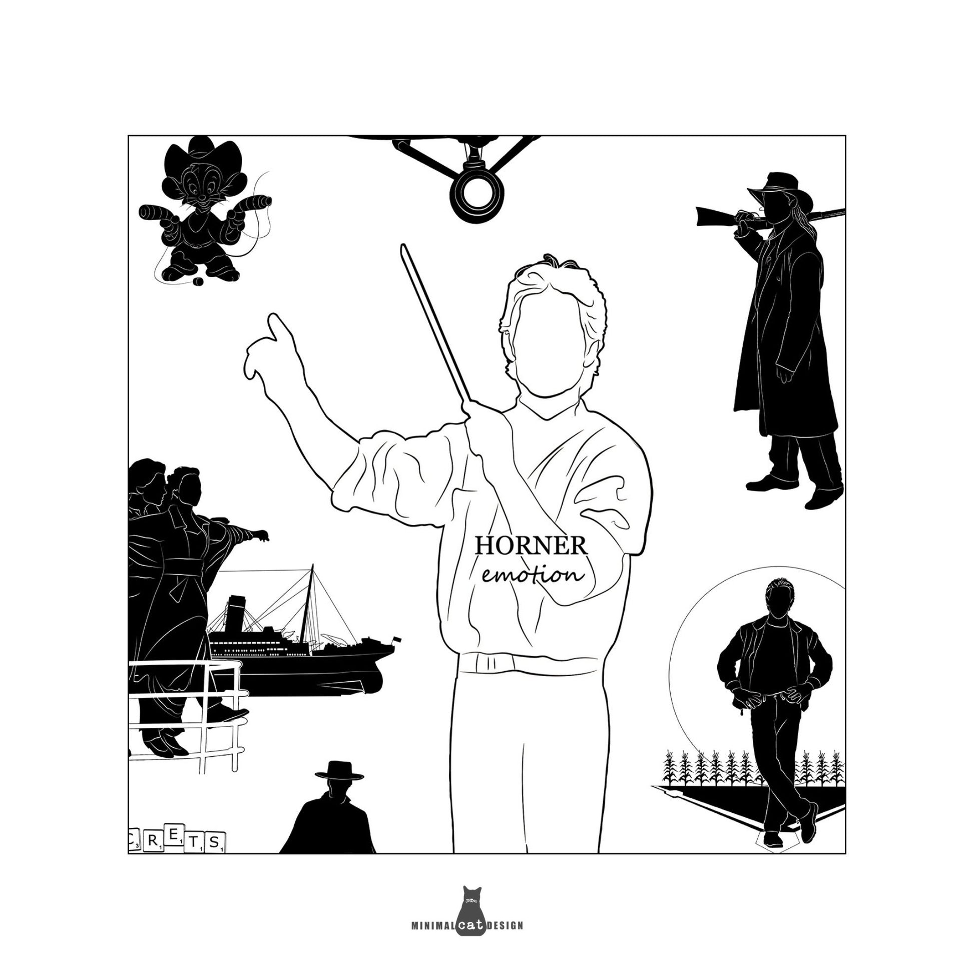 🎼 Este póster minimalista "Horner Emotion" rinde homenaje a James Horner mediante un elegante collage de siluetas en blanco y negro inspirado en sus películas más queridas. Desde transatlánticos y xenomorfos hasta naves espaciales y héroes enmascarados, cada figura evoca una película icónica encarnando la emoción y el drama de la música cinematográfica de Horner.