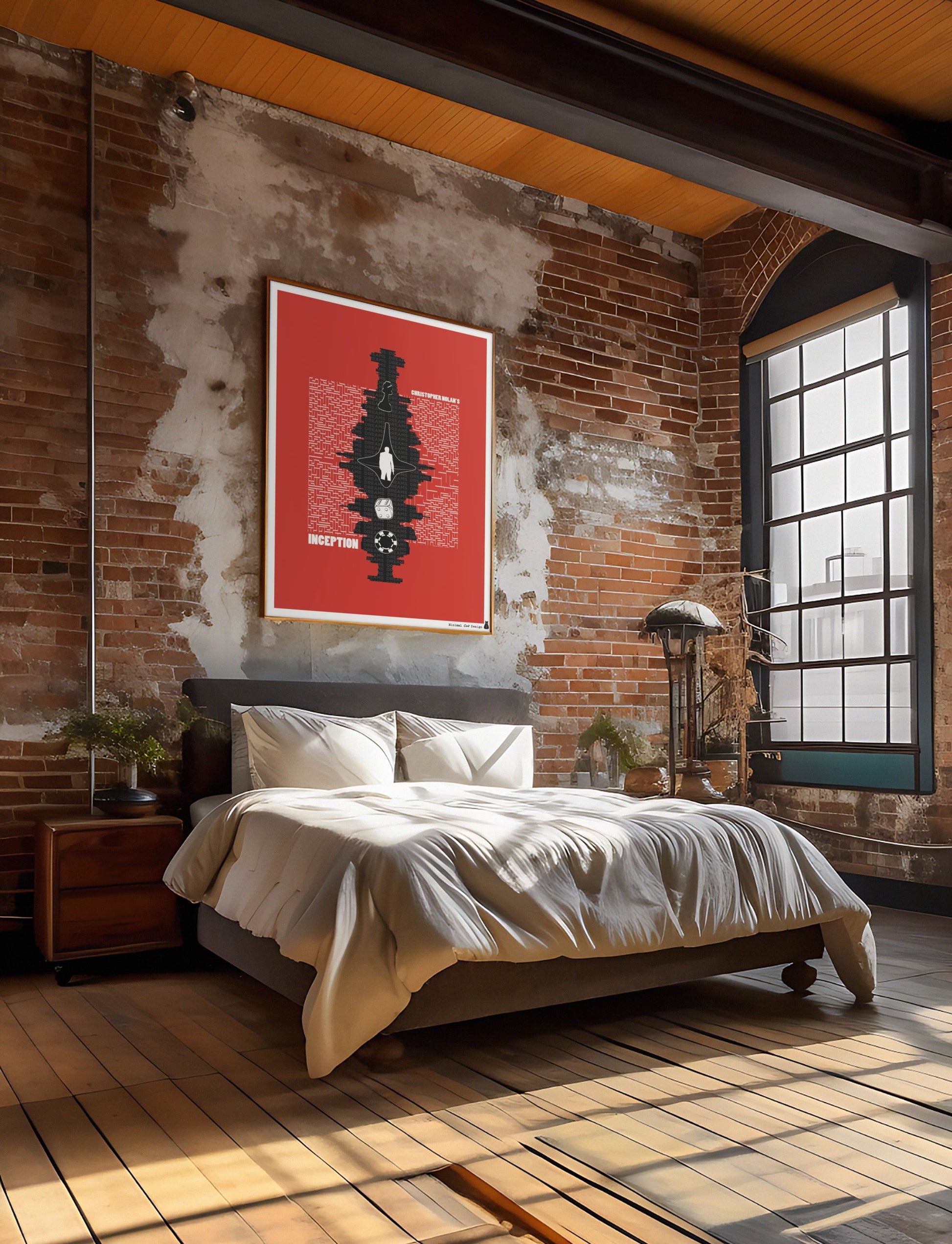 Un póster artístico para los amantes del cine que celebra la película Inception. Perfecto para decorar cualquier espacio con un toque cinematográfico.