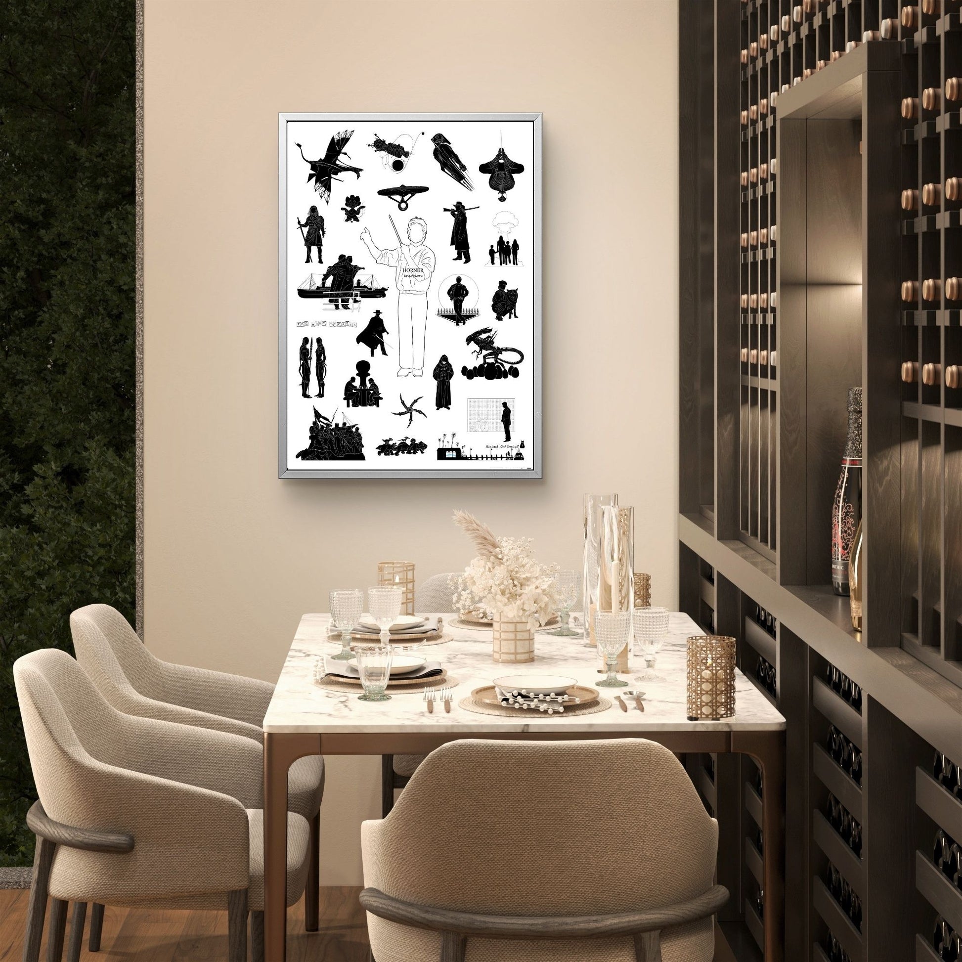 🎼 Este póster minimalista "Horner Emotion" rinde homenaje a James Horner mediante un elegante collage de siluetas en blanco y negro inspirado en sus películas más queridas. Desde transatlánticos y xenomorfos hasta naves espaciales y héroes enmascarados, cada figura evoca una película icónica encarnando la emoción y el drama de la música cinematográfica de Horner.